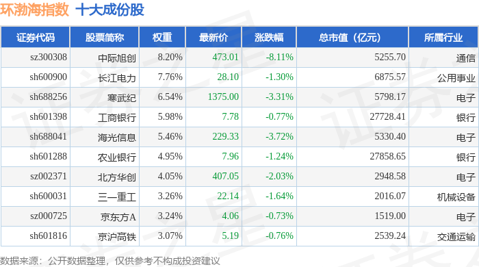 证券之星消息,10月31日,环渤海(399357)指数报收于3511.85点,跌1.91%,成交1168.5亿元,换手率0.42%。当日该指数成份股中,上涨的有9家,中国中免以4.06%的涨幅领涨,下跌的有30家,中际旭创以8.11%的跌幅领跌。