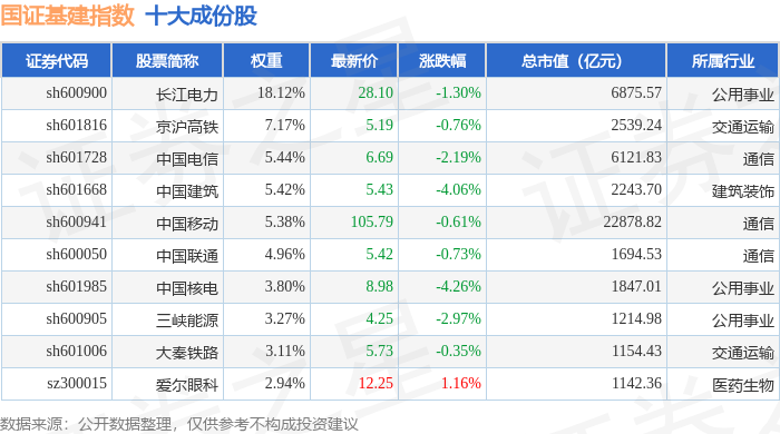 证券之星消息,10月31日,国证基建(399359)指数报收于2718.31点,跌1.69%,成交414.16亿元,换手率0.9%。当日该指数成份股中,上涨的有4家,四川路桥以4.75%的涨幅领涨,下跌的有45家,中国核建以10.03%的跌幅领跌。