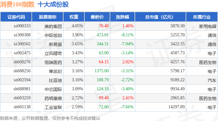 证券之星消息,10月31日,消费100(399364)指数报收于10962.27点,跌2.31%,成交3517.38亿元,换手率1.79%。当日该指数成份股中,上涨的有48家,三六零以10.02%的涨幅领涨,下跌的有51家,胜宏科技以10.53%的跌幅领跌。