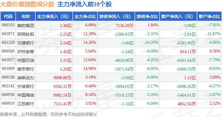 资金流向方面,大盘价值(399373)指数成份股当日主力资金净流出合计20.2亿元,游资资金净流入合计12.51亿元,散户资金净流入合计7.68亿元。成份股资金流向详情见下表: