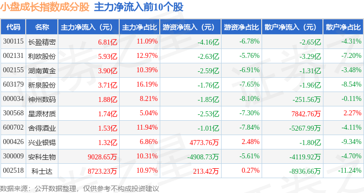 资金流向方面,小盘成长(399376)指数成份股当日主力资金净流出合计38.22亿元,游资资金净流入合计3788.78万元,散户资金净流入合计37.84亿元。成份股资金流向详情见下表: