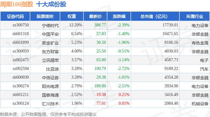 证券之星消息,10月31日,周期100(399402)指数报收于3788.59点,跌1.63%,成交2381.61亿元,换手率1.02%。当日该指数成份股中,上涨的有29家,拓普集团以5.01%的涨幅领涨,下跌的有65家,鹏鼎控股以9.61%的跌幅领跌。