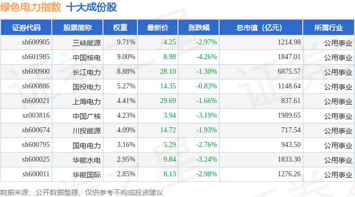 证券之星消息,10月31日,绿色电力(399438)指数报收于2122.81点,跌1.7%,成交273.61亿元,换手率1.19%。当日该指数成份股中,上涨的有13家,天富能源以4.0%的涨幅领涨,下跌的有34家,中国核电以4.26%的跌幅领跌。