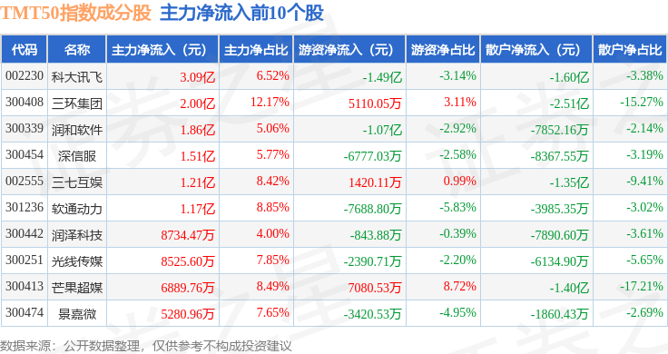 资金流向方面,TMT50(399610)指数成份股当日主力资金净流出合计191.85亿元,游资资金净流入合计74.29亿元,散户资金净流入合计117.56亿元。成份股资金流向详情见下表: