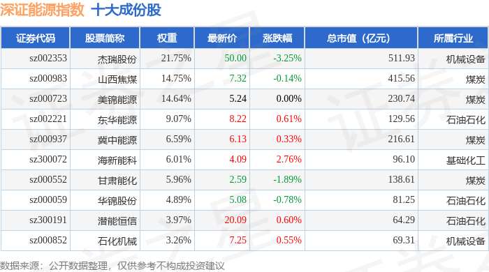 证券之星消息,10月31日,深证能源(399613)指数报收于3216.27点,跌0.51%,成交34.56亿元,换手率2.15%。当日该指数成份股中,上涨的有7家,海新能科以2.76%的涨幅领涨,下跌的有4家,杰瑞股份以3.25%的跌幅领跌。