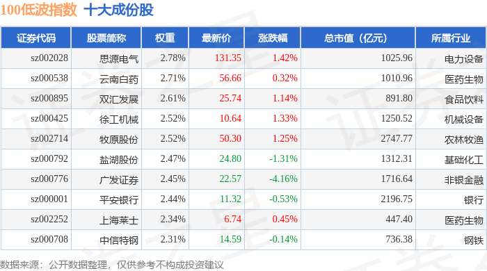 证券之星消息,10月31日,100低波(399645)指数报收于9532.91点,跌0.25%,成交666.54亿元,换手率1.06%。当日该指数成份股中,上涨的有24家,潍柴动力以3.6%的涨幅领涨,下跌的有25家,三环集团以4.24%的跌幅领跌。