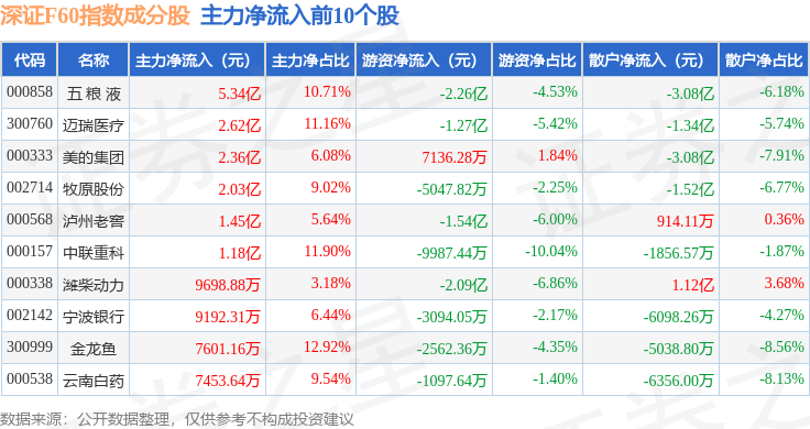 资金流向方面,深证F60(399701)指数成份股当日主力资金净流出合计70.98亿元,游资资金净流入合计16.79亿元,散户资金净流入合计54.19亿元。成份股资金流向详情见下表: