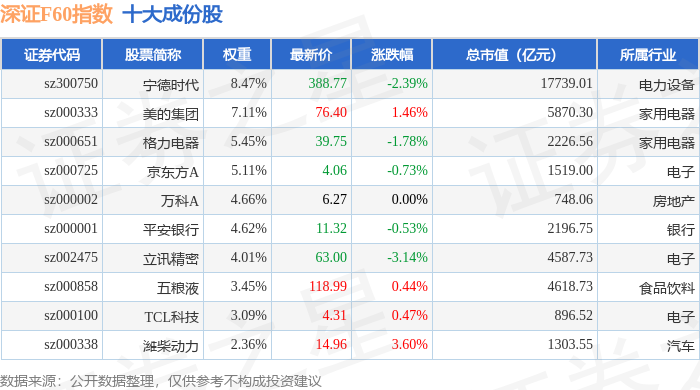证券之星消息,10月31日,深证F60(399701)指数报收于8118.84点,跌0.57%,成交1174.51亿元,换手率1.19%。当日该指数成份股中,上涨的有23家,潍柴动力以3.6%的涨幅领涨,下跌的有34家,铜陵有色以4.17%的跌幅领跌。