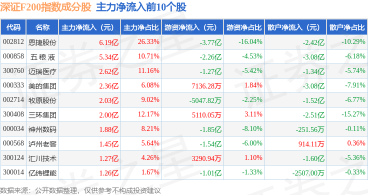 资金流向方面,深证F200(399703)指数成份股当日主力资金净流出合计182.62亿元,游资资金净流入合计60.73亿元,散户资金净流入合计121.89亿元。成份股资金流向详情见下表: