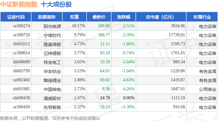 中证新能(399808)指数十大成份股详情如下: