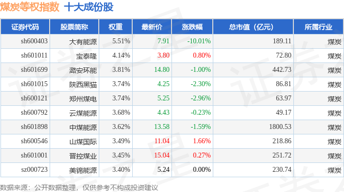 煤炭等权(399990)指数十大成份股详情如下:
