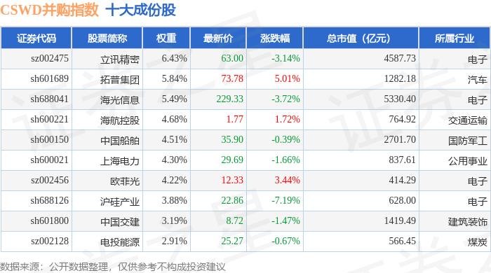 证券之星消息,10月31日,CSWD并购(399992)指数报收于2158.94点,涨0.24%,成交647.08亿元,换手率2.39%。当日该指数成份股中,上涨的有67家,粤传媒以10.02%的涨幅领涨,下跌的有31家,光库科技以7.35%的跌幅领跌。