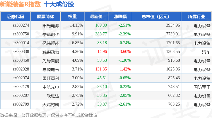 资金流向方面,新能装备R(470043)指数成份股当日主力资金净流出合计40.43亿元,游资资金净流出合计3733.4万元,散户资金净流入合计40.8亿元。成份股资金流向详情见下表: