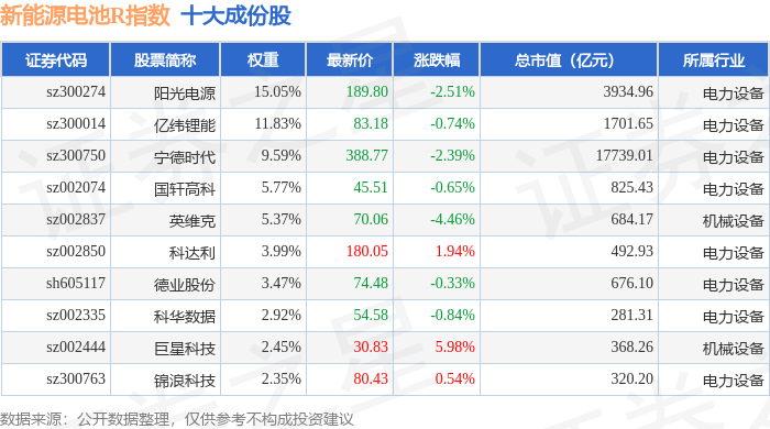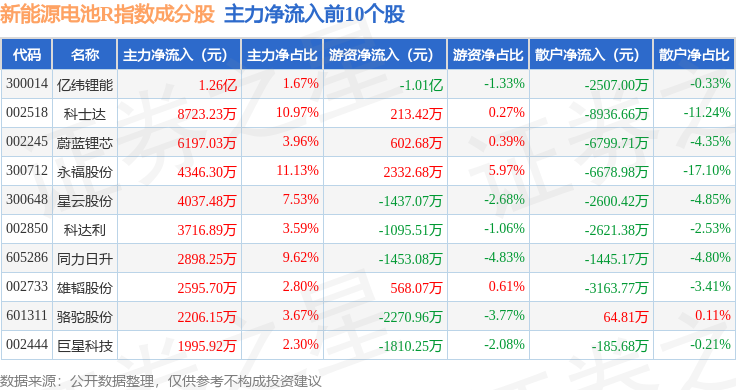 资金流向方面,新能源电池R(480027)指数成份股当日主力资金净流出合计37.12亿元,游资资金净流入合计5.91亿元,散户资金净流入合计31.21亿元。成份股资金流向详情见下表: