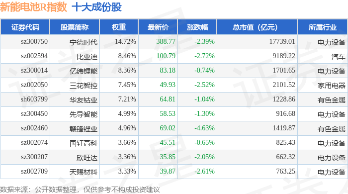 新能电池R(480032)指数十大成份股详情如下: