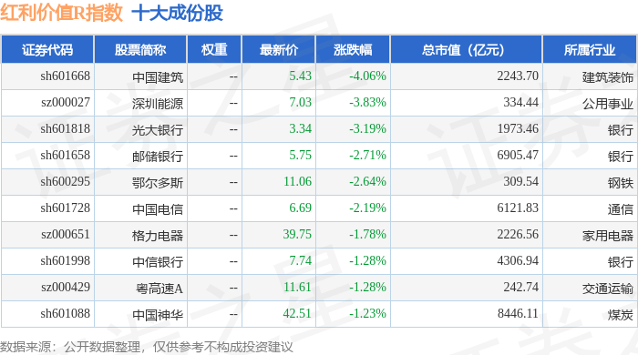 证券之星消息,10月31日,红利价值R(489016)指数报收于7743.3点,涨0.03%,成交440.1亿元,换手率0.45%。当日该指数成份股中,上涨的有22家,南京高科以7.08%的涨幅领涨,下跌的有25家,中国建筑以4.06%的跌幅领跌。