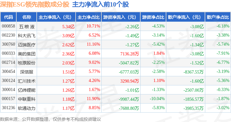 资金流向方面,深指ESG领先(970029)指数成份股当日主力资金净流出合计234.2亿元,游资资金净流入合计79.1亿元,散户资金净流入合计155.1亿元。成份股资金流向详情见下表: