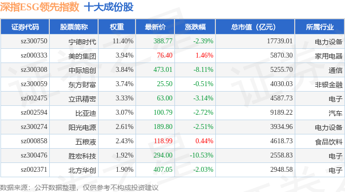 深指ESG领先(970029)指数十大成份股详情如下: