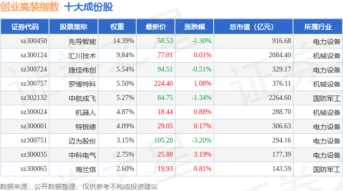 创业高装(970040)指数十大成份股详情如下: