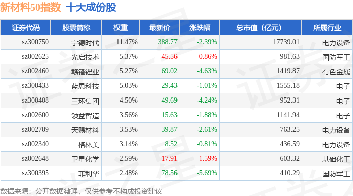 证券之星消息,10月31日,新材料50(970042)指数报收于3670.6点,跌0.75%,成交1047.88亿元,换手率4.03%。当日该指数成份股中,上涨的有21家,恩捷股份以10.0%的涨幅领涨,下跌的有29家,中钨高新以10.0%的跌幅领跌。