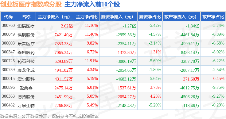 资金流向方面,创业板医疗(970082)指数成份股当日主力资金净流入合计7.15亿元,游资资金净流出合计4.02亿元,散户资金净流出合计3.13亿元。成份股资金流向详情见下表:
