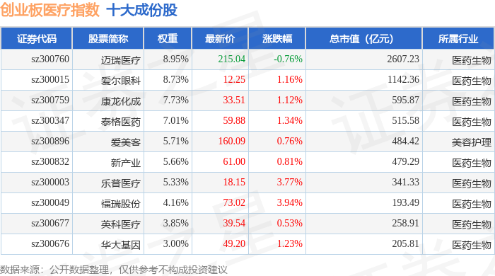 证券之星消息,10月31日,创业板医疗(970082)指数报收于3935.2点,涨1.45%,成交156.3亿元,换手率1.92%。当日该指数成份股中,上涨的有45家,诺思格以7.0%的涨幅领涨,下跌的有5家,可孚医疗以4.35%的跌幅领跌。