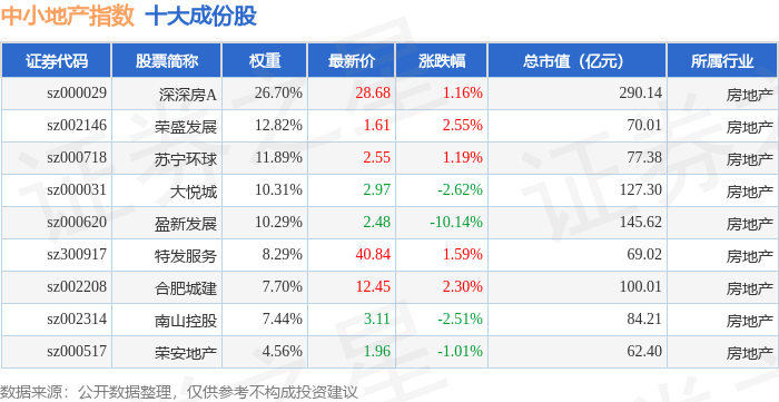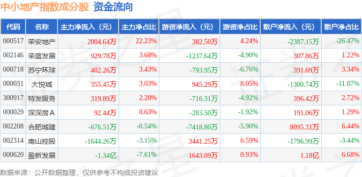 资金流向方面,中小地产(971002)指数成份股当日主力资金净流出合计1.16亿元,游资资金净流出合计4038.07万元,散户资金净流入合计1.57亿元。成份股资金流向详情见下表: