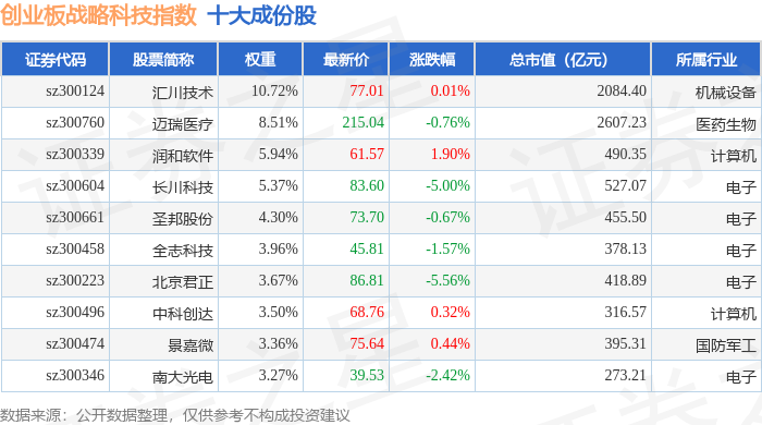 创业板战略科技(971004)指数十大成份股详情如下: