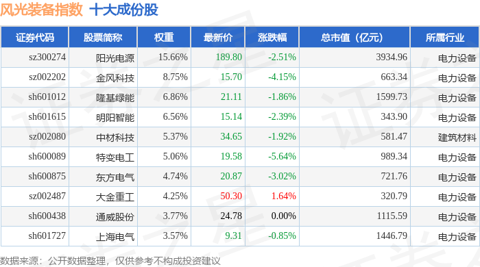 风光装备(980026)指数十大成份股详情如下: