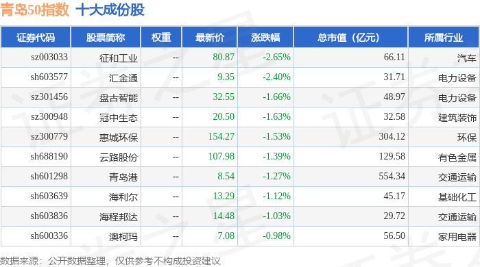 证券之星消息,10月31日,青岛50(989011)指数报收于2427.95点,涨0.87%,成交122.06亿元,换手率2.01%。当日该指数成份股中,上涨的有22家,日辰股份以10.0%的涨幅领涨,下跌的有18家,征和工业以2.65%的跌幅领跌。