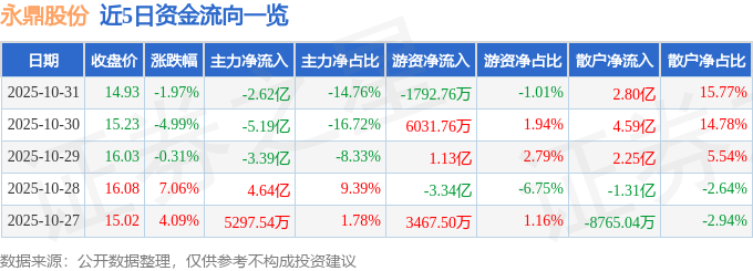 10月31日的资金流向数据方面,主力资金净流出2.62亿元,占总成交额14.76%,游资资金净流出1792.76万元,占总成交额1.01%,散户资金净流入2.8亿元,占总成交额15.77%。