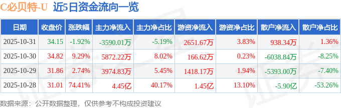 证券之星消息,截至2025年10月31日收盘,C必贝特(688759)报收于34.15元,下跌1.92%,换手率42.39%,成交量19.69万手,成交额6.92亿元。