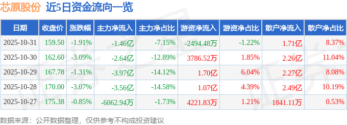 10月31日的资金流向数据方面,主力资金净流出1.46亿元,占总成交额7.15%,游资资金净流出2494.48万元,占总成交额1.22%,散户资金净流入1.71亿元,占总成交额8.37%。
