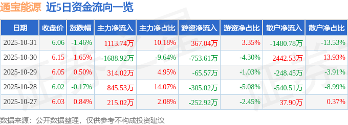证券之星消息,截至2025年10月31日收盘,通宝能源(600780)报收于6.06元,下跌1.46%,换手率1.57%,成交量18.0万手,成交额1.09亿元。