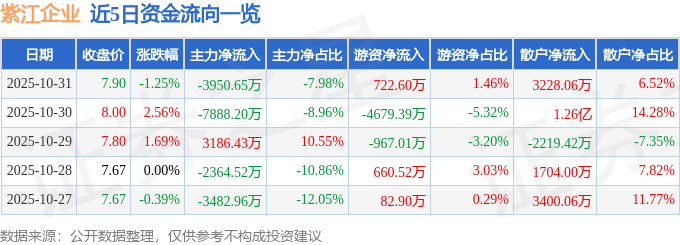 证券之星消息,截至2025年10月31日收盘,紫江企业(600210)报收于7.9元,下跌1.25%,换手率4.08%,成交量61.9万手,成交额4.95亿元。