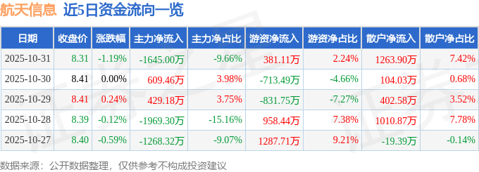 证券之星消息,截至2025年10月31日收盘,航天信息(600271)报收于8.31元,下跌1.19%,换手率1.11%,成交量20.52万手,成交额1.7亿元。