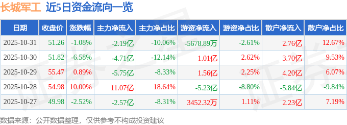 证券之星消息,截至2025年10月31日收盘,长城军工(601606)报收于51.26元,下跌1.08%,换手率5.81%,成交量42.11万手,成交额21.75亿元。