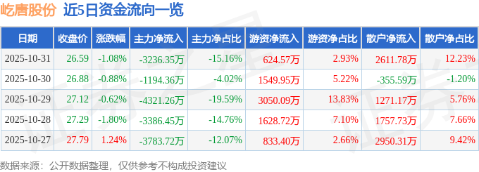 10月31日的资金流向数据方面,主力资金净流出3236.35万元,占总成交额15.16%,游资资金净流入624.57万元,占总成交额2.93%,散户资金净流入2611.78万元,占总成交额12.23%。