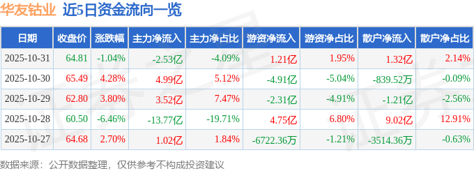10月31日的资金流向数据方面,主力资金净流出2.53亿元,占总成交额4.09%,游资资金净流入1.21亿元,占总成交额1.95%,散户资金净流入1.32亿元,占总成交额2.14%。