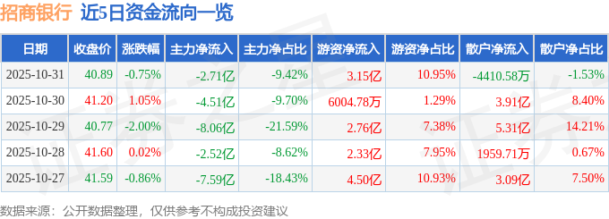 证券之星消息,截至2025年10月31日收盘,招商银行(600036)报收于40.89元,下跌0.75%,换手率0.34%,成交量70.26万手,成交额28.82亿元。