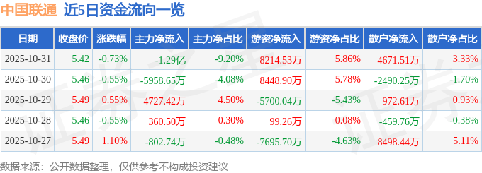 证券之星消息,截至2025年10月31日收盘,中国联通(600050)报收于5.42元,下跌0.73%,换手率0.84%,成交量258.32万手,成交额14.01亿元。