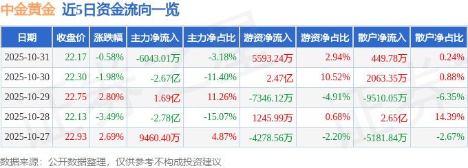 证券之星消息,截至2025年10月31日收盘,中金黄金(600489)报收于22.17元,下跌0.58%,换手率1.76%,成交量85.5万手,成交额19.0亿元。