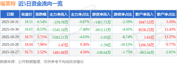 证券之星消息,截至2025年10月31日收盘,福莱特(601865)报收于18.51元,下跌0.54%,换手率1.6%,成交量30.41万手,成交额5.67亿元。