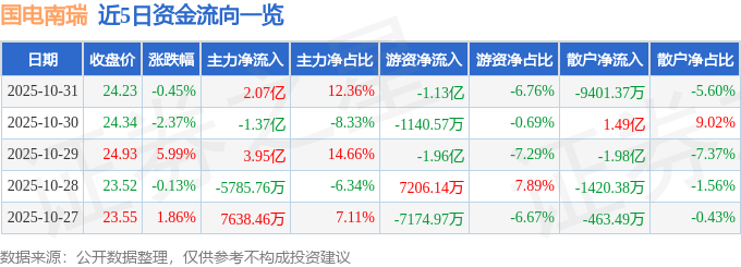 证券之星消息,截至2025年10月31日收盘,国电南瑞(600406)报收于24.23元,下跌0.45%,换手率0.86%,成交量68.45万手,成交额16.78亿元。