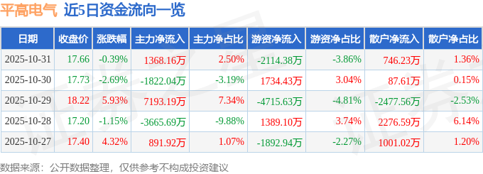 证券之星消息,截至2025年10月31日收盘,平高电气(600312)报收于17.66元,下跌0.39%,换手率2.27%,成交量30.84万手,成交额5.47亿元。