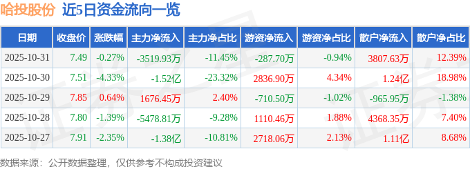 证券之星消息,截至2025年10月31日收盘,哈投股份(600864)报收于7.49元,下跌0.27%,换手率1.97%,成交量40.9万手,成交额3.07亿元。