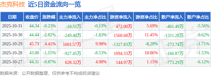 证券之星消息,截至2025年10月31日收盘,杰克科技(603337)报收于44.34元,下跌0.23%,换手率0.4%,成交量1.87万手,成交额8300.5万元。