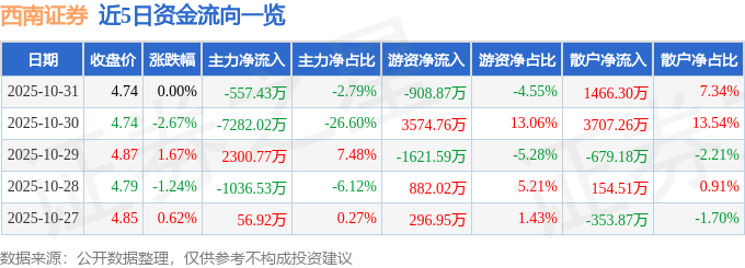 证券之星消息,截至2025年10月31日收盘,西南证券(600369)报收于4.74元,上涨0.0%,换手率0.63%,成交量41.99万手,成交额2.0亿元。