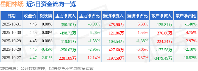 证券之星消息,截至2025年10月31日收盘,岳阳林纸(600963)报收于4.45元,上涨0.0%,换手率1.15%,成交量20.15万手,成交额8971.3万元。