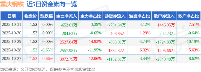 证券之星消息,截至2025年10月31日收盘,重庆钢铁(601005)报收于1.52元,上涨0.0%,换手率1.52%,成交量126.61万手,成交额1.93亿元。